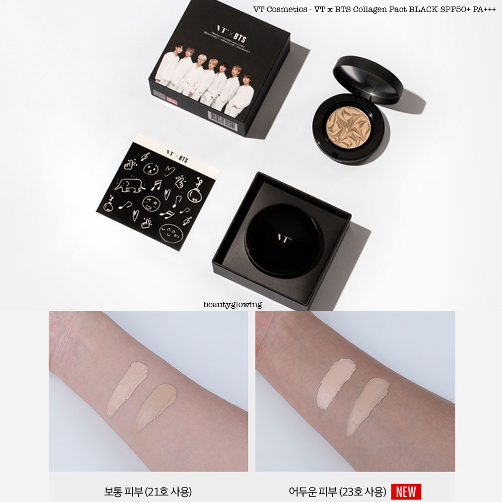 Vt cosmetics have some variants of collagen pact black blue red berry and more but for their collaboration with bts they just released two variants only. They claimed that the black collagen has matte finish and good coverage suitable for. Set a vtxbts collagen pact white 21 cica sun spray set b vtxbts collagen pact white 23 cica sun spray.